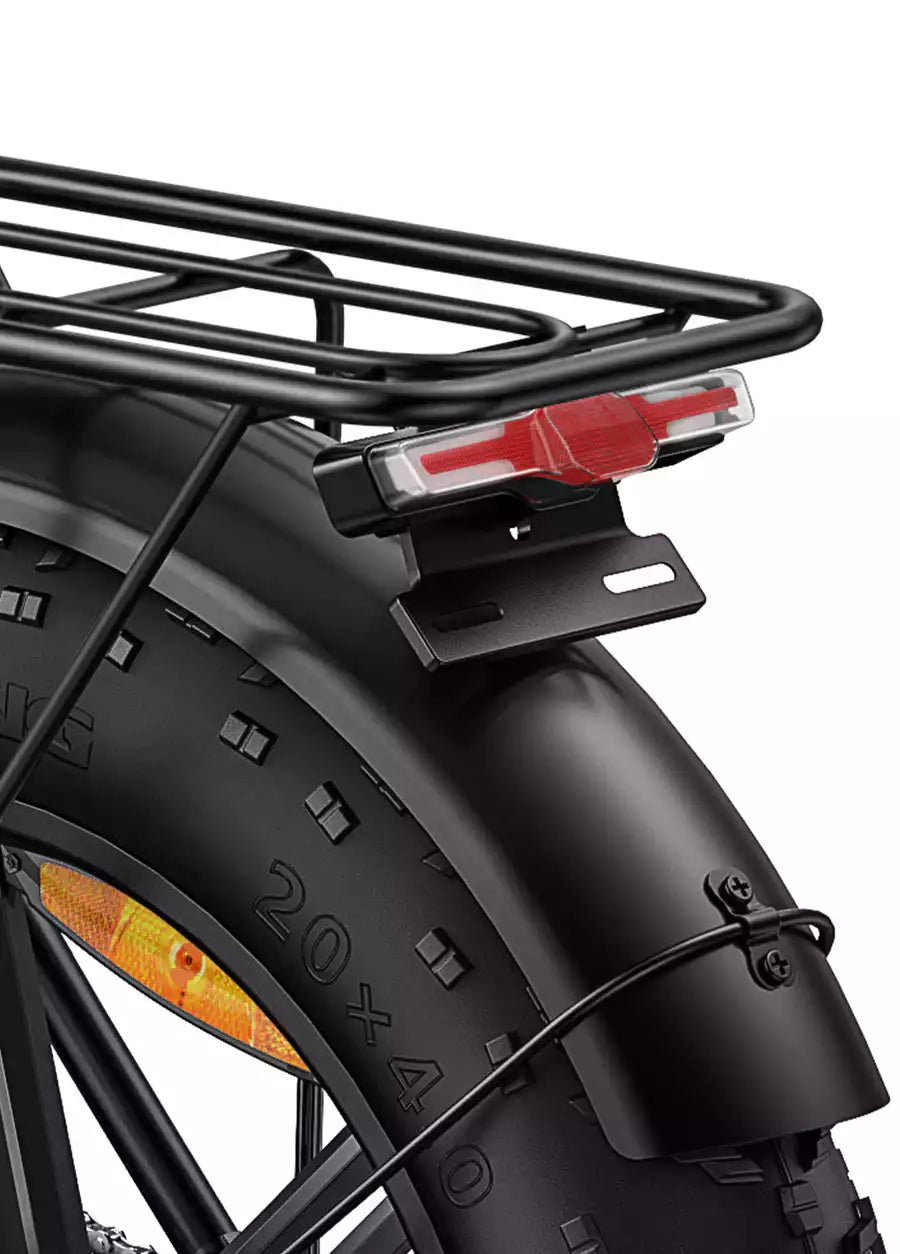 Le porte-bagages arrière durable et solide du Engine EP-2 PRO est inégalé par la plupart des autres vélos électriques. Grâce à son renfort supplémentaire, le transporteur peut transporter jusqu’à 50 kg de fret ou même une personne supplémentaire plus légère. Cela fonctionne bien avec Engwe sacs porte-vélo, qui peut contenir jusqu’à 35 litres et éventuellement deux batteries supplémentaires pour des trajets exceptionnellement longs. Le garde-boue en métal est à double fixation sous le porte-bagages arrière.